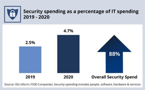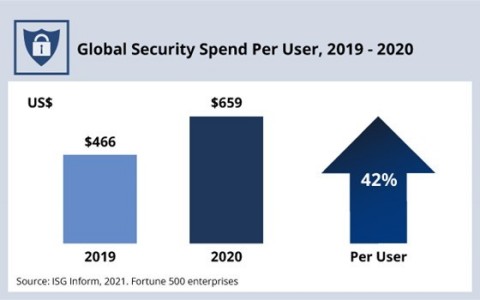 According to ISG Research, enterprise cybersecurity spending per user increased by more than 40 percent between 2019 and 2020 (Figure 1). As a percentage of total IT spending, cybersecurity nearly doubled year over year, accounting for 4.7 percent of spend in 2020, versus 2.5 percent in 2019 (Figure 2). Nearly three-quarters of ISG advisors say their clients plan to increase their security spending this year, even before the unprecedented SolarWinds and Exchange breaches in the first quarter.